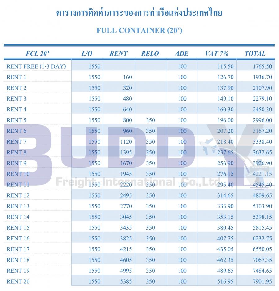 ตารางการคิดค่าภาระของการท่าเรือแห่งประเทศไทย FULL CONTAINER (20’) และ FULL CONTAINER (40’)