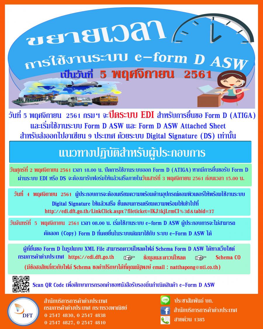 (ข่าวสาร) ขยายเวลาการใช้งานระบบ e-form D ASW เป็นวันที่ 5 พฤศจิกายน 2561